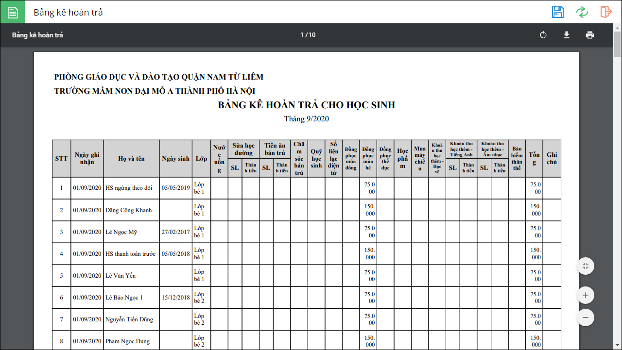 5. Kế toán mong muốn có danh sách hoàn trả để thực hiện hoàn trả tiền cho phụ huynh