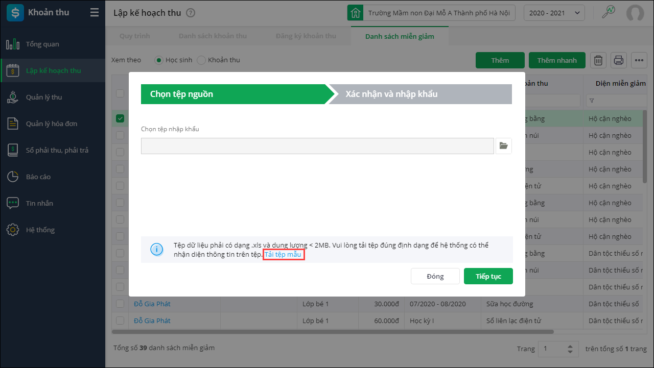 - Tải tệp mẫu excel nhập khẩu danh sách học sinh do phần mềm cung cấp.
