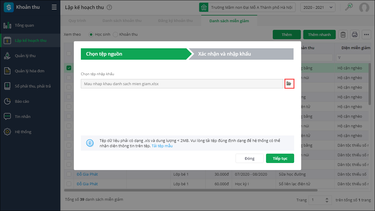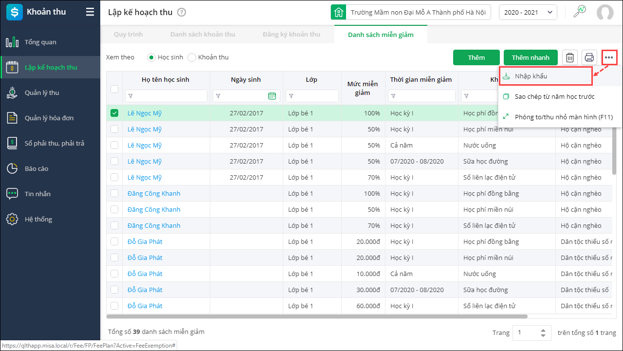 - Vào Khoản thu\Lập Kế hoạch thu\Danh sách miễn giảm