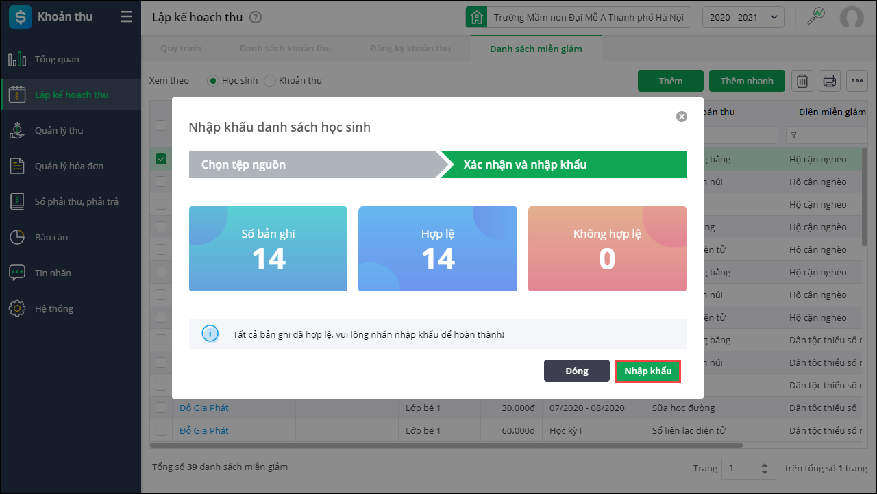 - Nhấn Nhập khẩu để nhập khẩu bản ghi danh sách miễn giảm hợp lệ vào phần mềm.
